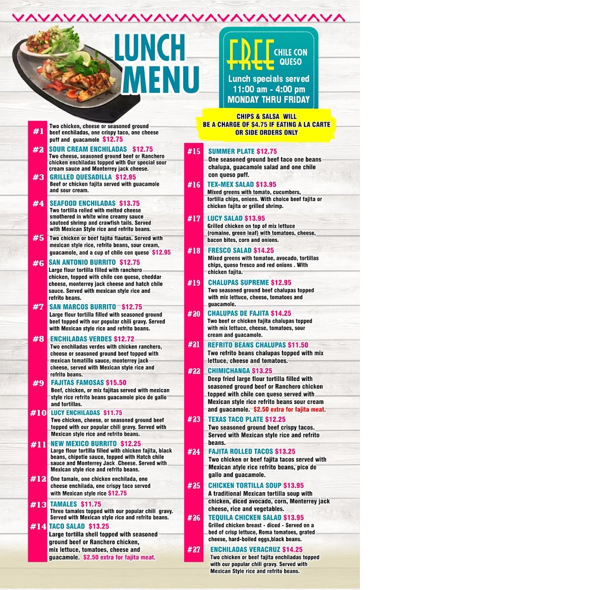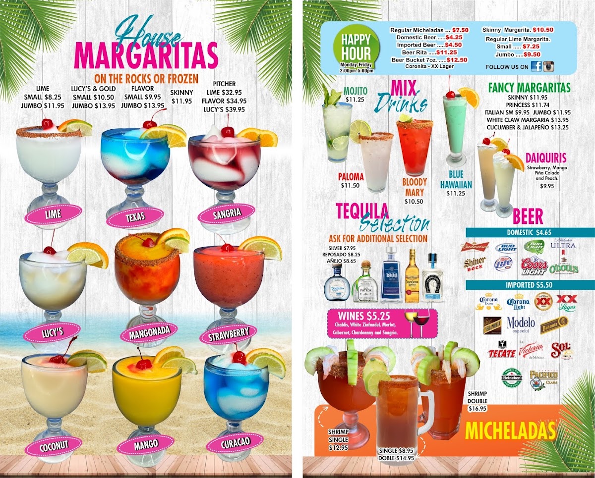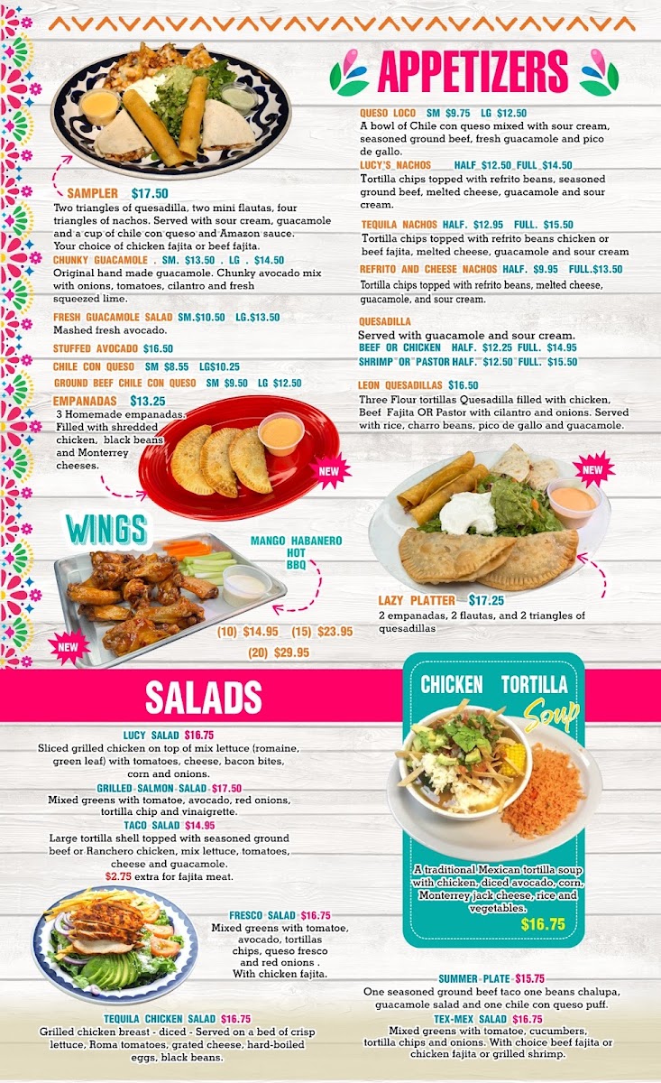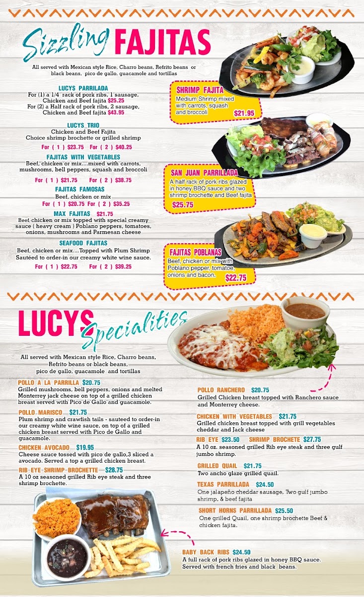 Welcome to Lucy Tequilas, a culinary gem nestled in Schulenburg, Texas. Known for its vibrant atmosphere and exceptional service, this restaurant serves an enticing menu that celebrates the heart of Mexican cuisine. Highlights include the Chicken Brochette—savory chicken wrapped with jalapeño and Monterey Jack cheese in bacon at just $20.95. The Ribeye Steak, paired with jumbo shrimp, is a meaty delight at $22.95, while the Baby Back Ribs slathered in honey BBQ sauce entice with every bite for $23.95.