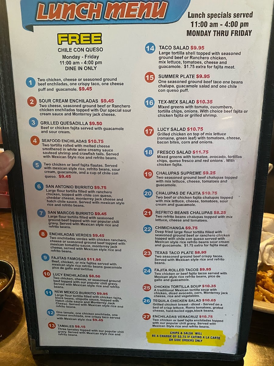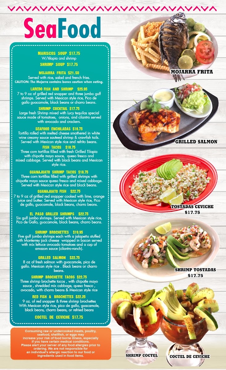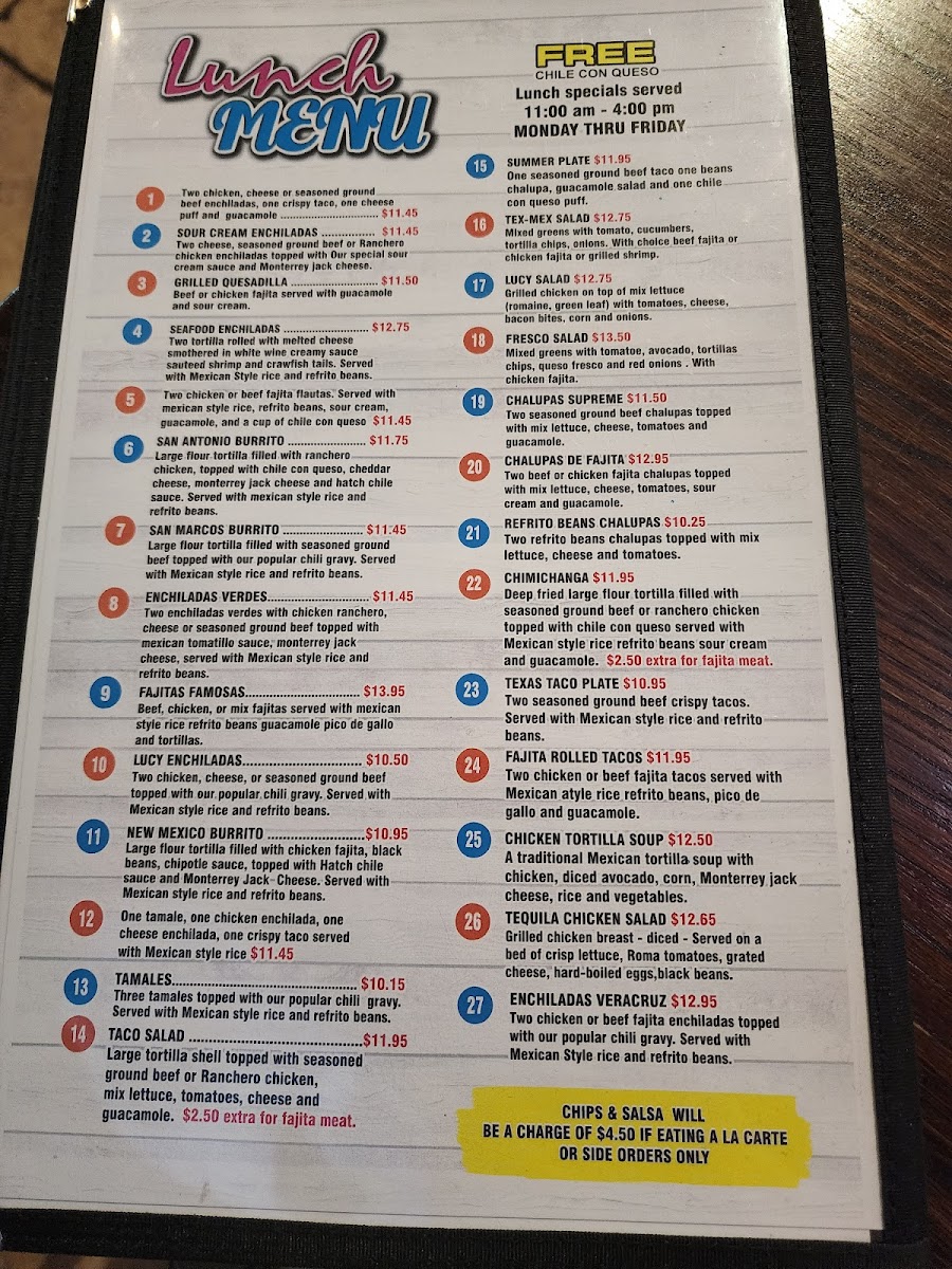Welcome to Lucy Tequilas, a culinary gem nestled in Schulenburg, Texas. Known for its vibrant atmosphere and exceptional service, this restaurant serves an enticing menu that celebrates the heart of Mexican cuisine. Highlights include the Chicken Brochette—savory chicken wrapped with jalapeño and Monterey Jack cheese in bacon at just $20.95. The Ribeye Steak, paired with jumbo shrimp, is a meaty delight at $22.95, while the Baby Back Ribs slathered in honey BBQ sauce entice with every bite for $23.95.